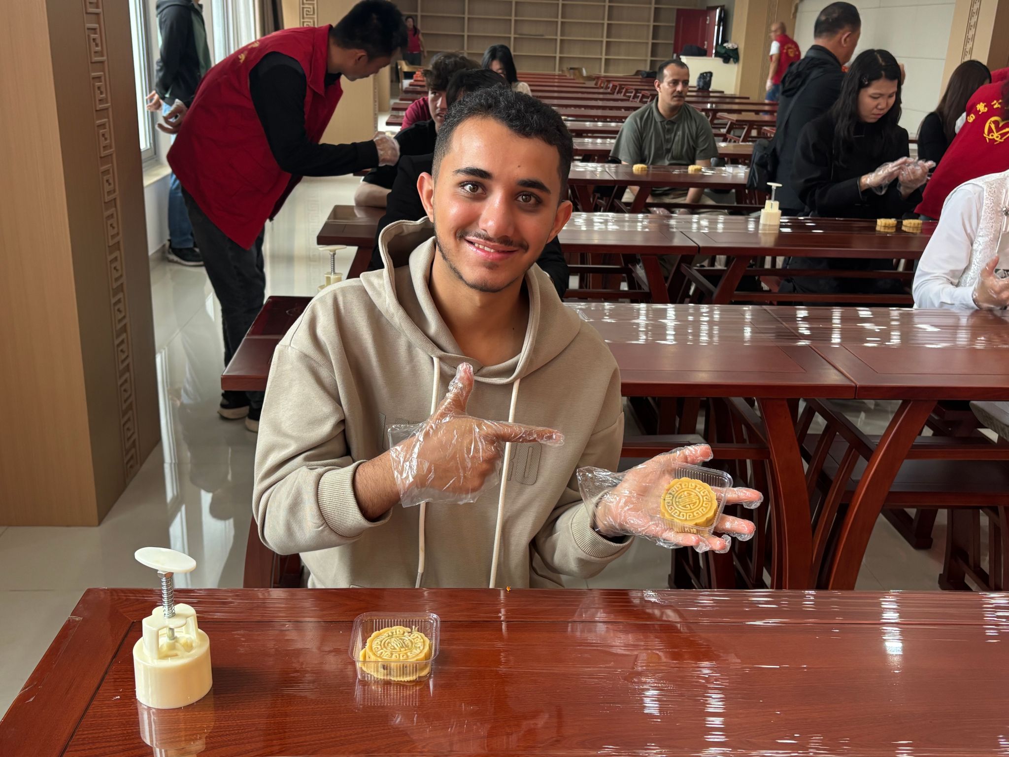“匠心手作”环节是此次活动的核心。留学生们分为两组,同步体验剪纸与月饼制作:剪纸组在老师指导下,了解滨州民间剪纸传承脉络与中秋习俗后,亲手创作玉兔、蝴蝶等中秋主题剪纸作品,完成后纷纷与作品合影留念;月饼组则跟着面点师傅学习揉面、包馅、压模等步骤,一个个印着精美花纹的月饼新鲜出炉,现场满是面粉的清香与欢声笑语,大家在动手实践中深切体会中秋“团圆、祈福”的文化内涵。