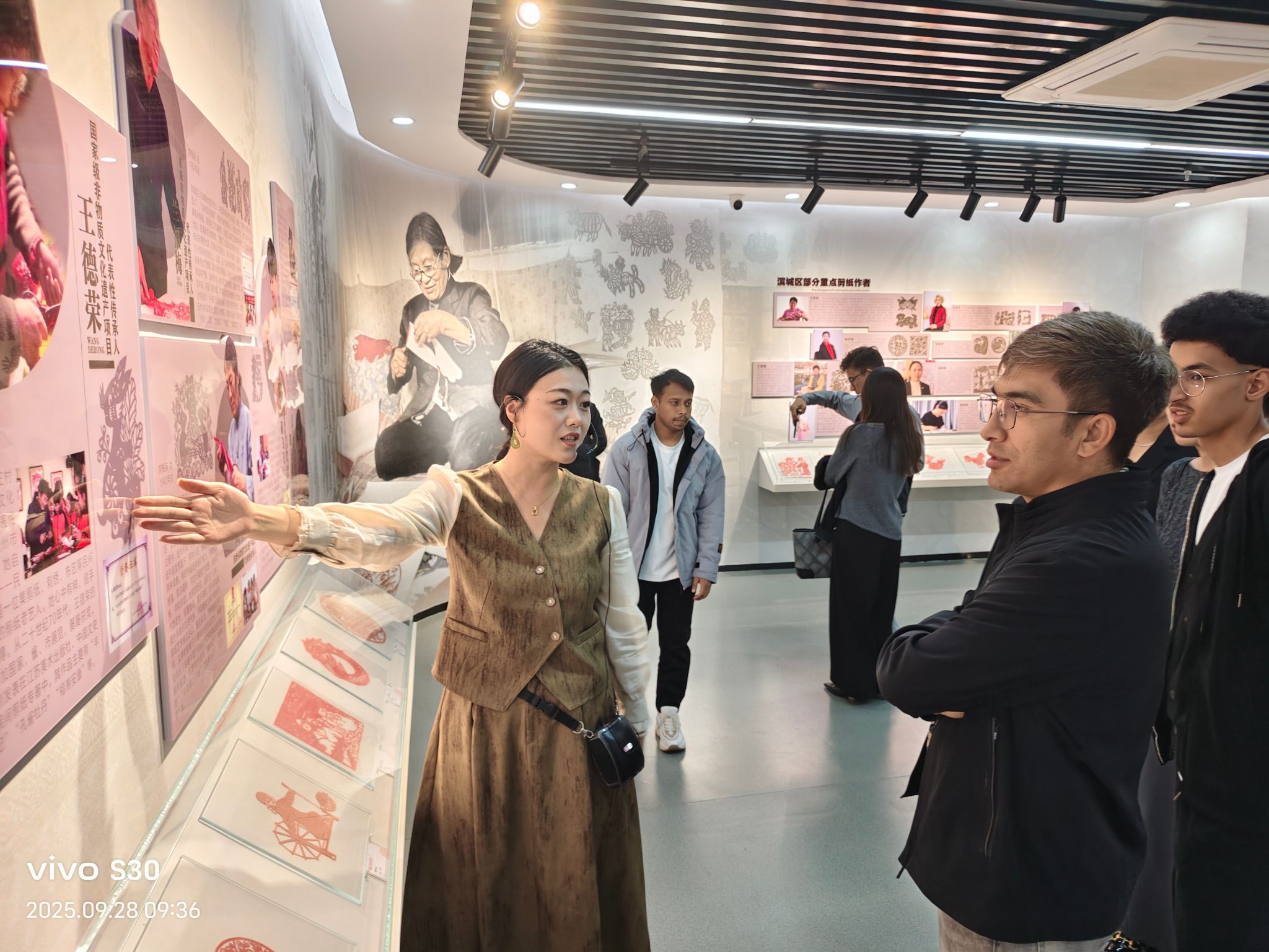 在讲解员的引导下,留学生们率先开启“文化初遇”环节,先后走进滨城区博物馆与剪纸艺术展。博物馆内,承载滨城千年历史的文物展品吸引众人驻足,大家或仔细聆听地域文化传承故事,或用手机记录感兴趣的展品细节;剪纸艺术展上,融入明月、玉兔等中秋元素的国家级非物质文化遗产——滨州民间剪纸作品,尽显传统技艺的精巧灵动,让留学生们频频发出赞叹,多国语言的交流探讨声不时在展厅内回响,东方文明的魅力在悄然间跨越国界。